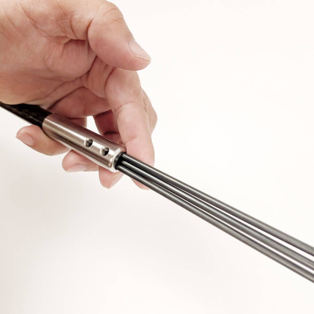 ピアノ線そのものを先端金具に差し込み、横から4本のイモネジで強力に固定。